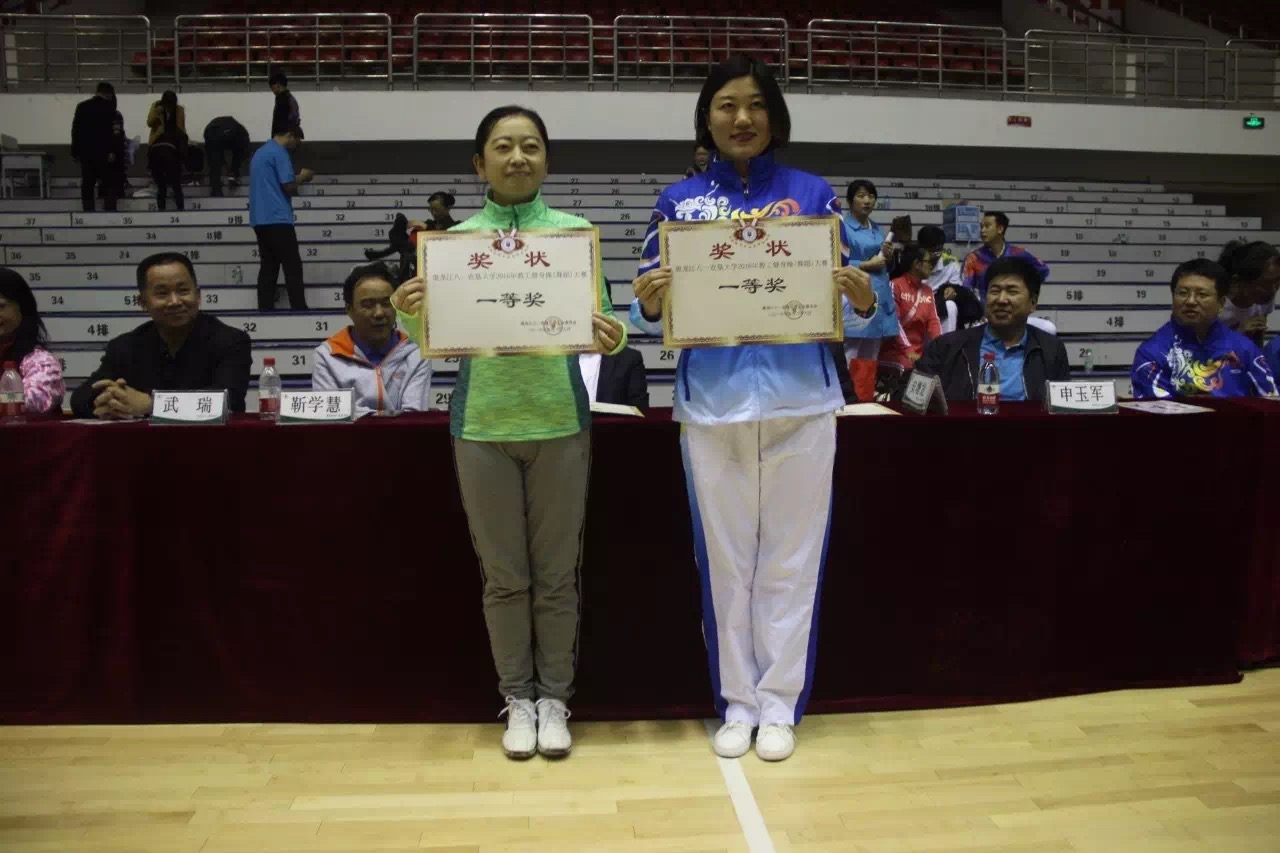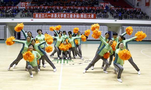 思政部的女老师们虽然年龄结构不占优势,训练时间也很有限,不仅要练习好广播体操的动作,还要用大量的时间和精力熟悉自选动作,但是我们还是坚持了下来,记不清有多少个夜晚我们在一起度过,说说笑笑,汗流浃背。正是女老师突破自我极限的挑战,使得我们的自选动作获得了14.69的高分。