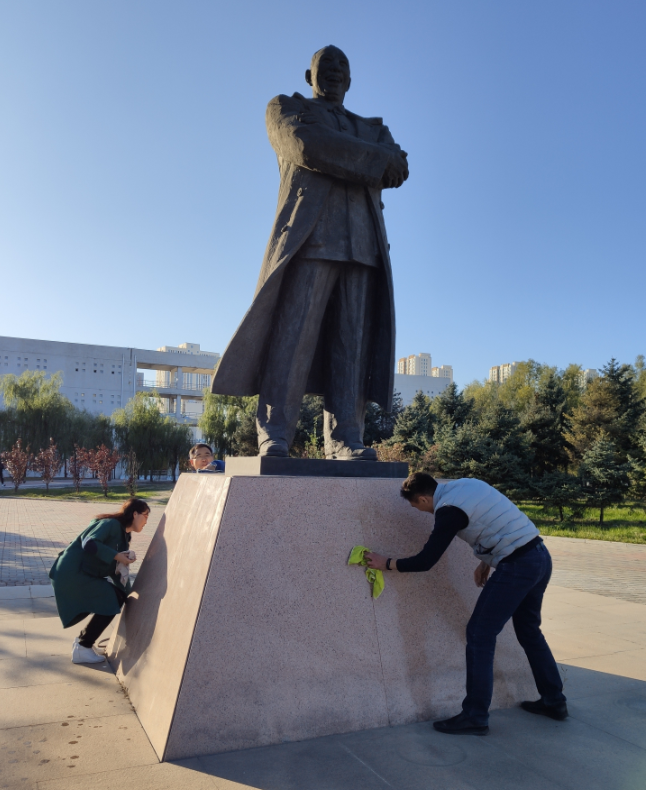 概论与纲要党支部党员拿着水桶、扫把、抹布等劳动工具,热情高涨地投入到大清扫中。有的手拿抹布擦洗将军像,有的拿起扫帚清除杂草、落叶枯枝,有的清运垃圾、杂物等,清扫将军像周边卫生,怀着崇敬的心情清扫王震将军像周边环境,以实际行动缅怀王震将军。