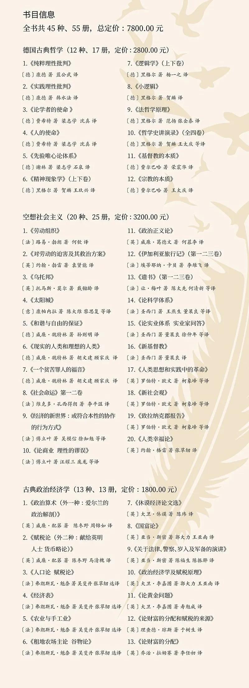作为中国目前唯一一套系统译介马克思主义来源的经典译丛,商务印书馆开出的这份“书单”,包括反映康德、黑格尔、费希特等人学说的德国古典哲学经典12种,展现圣西门、傅立叶、欧文等人学说的空想社会主义经典20种,体现配第、魁奈、亚当·斯密、李嘉图等人学说的古典政治经济学经典13种。