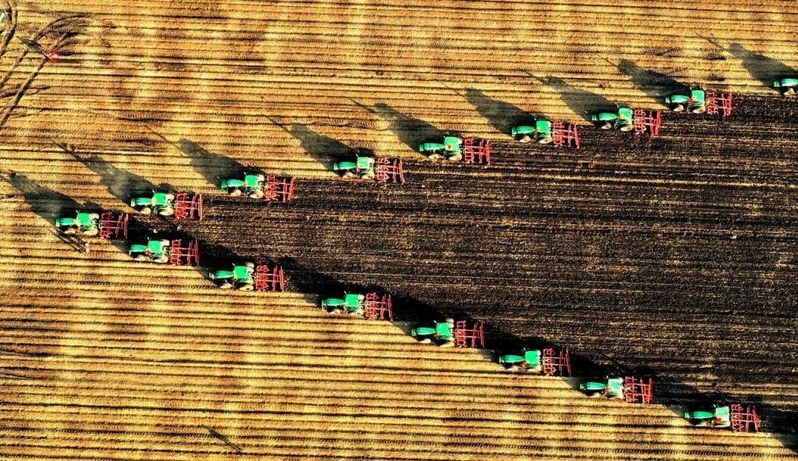 2020年9月30日,北大荒集团九三分公司尖山农场、鹤山农场的大豆、玉米、小麦田里几十台收获机车、灭茬、整地机车列队前进。