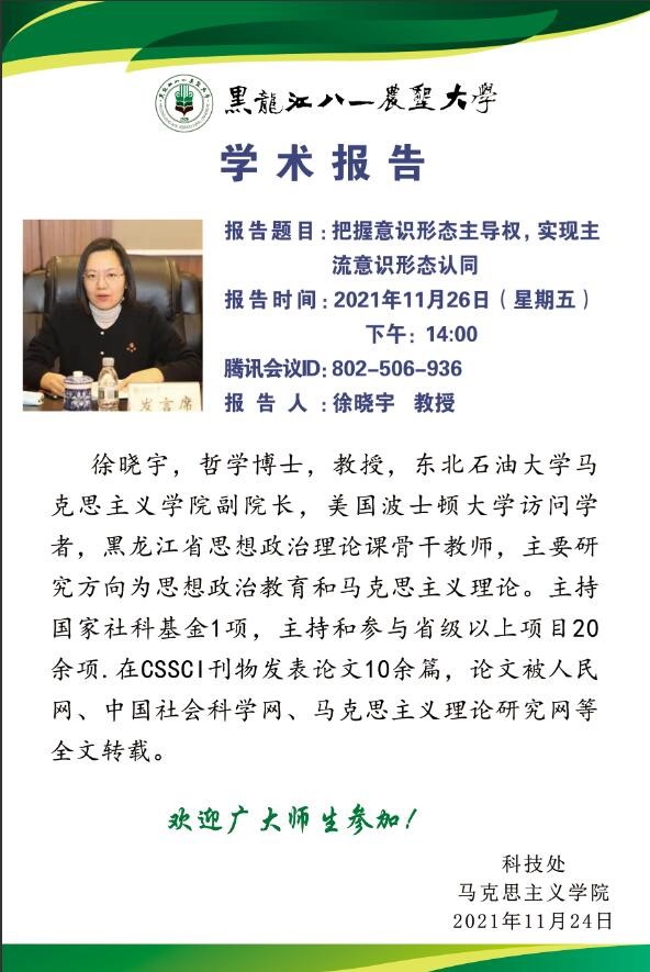 为深入学习十九届六中全会精神,切实提高思政课教师、思政工作者职业能力,11月26日下午,U8国际官网邀请东北石油大学U8国际官网副经理、黑龙江省思想政治理论课骨干教师徐晓宇教授以“把握意识形态主导权,实现主流意识形态认同”为主题开展学术报告。参加学术报告的有思政课教师、辅导员、相关职能部门工作人员以及博士研究生代表。报告会由U8国际官网副经理柴旺主持。