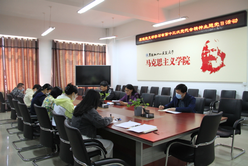 主题党日活动由支部书记刘丽杰主持,活动分为三个环节。首先是党支部书记进行省第十三次党代会报告领学,刘丽杰老师带领支部党员通篇学习了省第十三次党代会的报告内容。第二环节,支部成员围绕报告进行主题交流,党员们分别围绕粮食产量与粮食产业,科研成果与成果转化,黑龙江创新的思路、原因等进行了充分、热烈的讨论和交流。第三环节,支部成员进行学习心得交流,党员们结合党代会报告的学习,将党代会精神与思政课教学、思政课教师、意识形态教育、创新人才、科技创新、民生福祉、龙江精神传承等方面进行了学习心得交流。