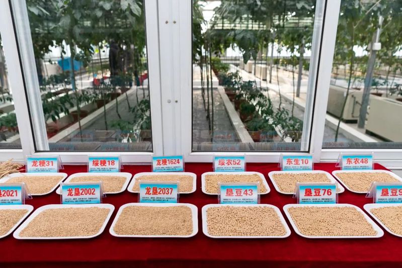 北大荒建三江国家农业科技园区内展示的水稻和大豆品种。新华社记者 谢剑飞 摄