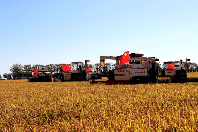 猗猗嘉禾,今盈我仓。秋日的北大荒,金灿灿的粮食又一次铺展在广袤黑土地上。