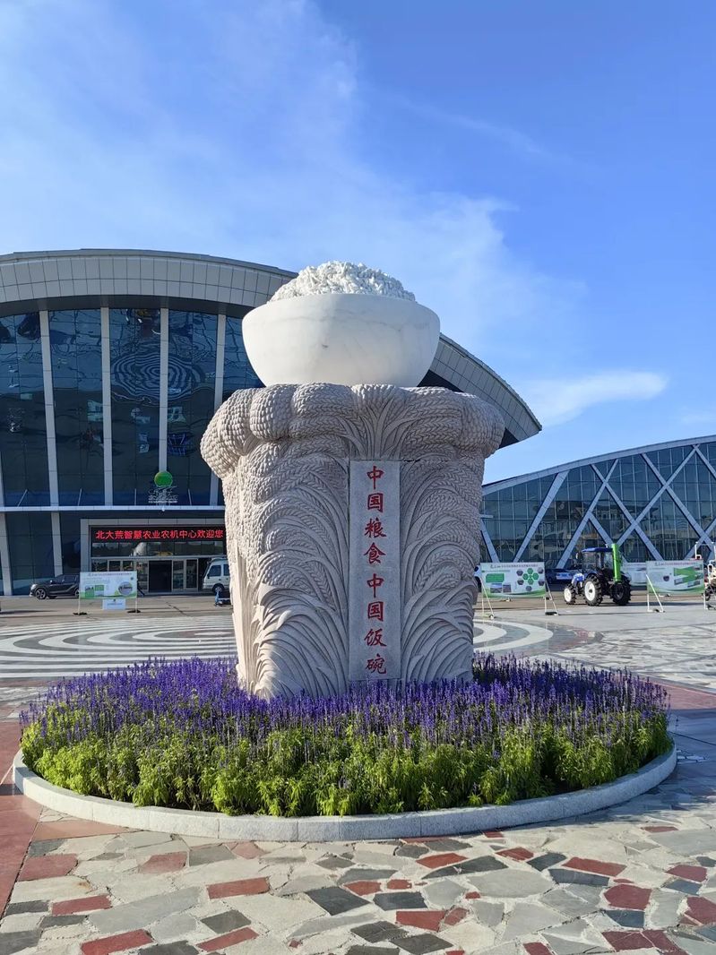 这是一只盛满粮食的饭碗。油润的大米泛着晶莹的光泽,空气中仿佛弥漫着缕缕饭香。基座四周,稻穗饱满低垂,中间拱卫着“中国粮食中国饭碗”八个鲜红大字。