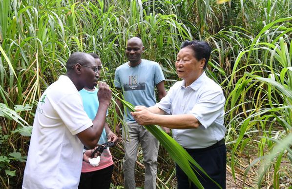 福建农林大学国家菌草工程技术研究中心首席科学家林占熺(右一)在福建农林大学菌草园让尼日利亚职工试尝幼嫩菌草的味道(2021年8月12日摄)。新华社记者 林善传 摄