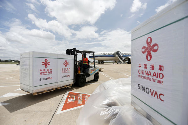 工作人员在柬埔寨金边国际机场运输中国政府援助柬埔寨的科兴新冠疫苗(2021年10月14日摄)。新华社发(批隆摄)