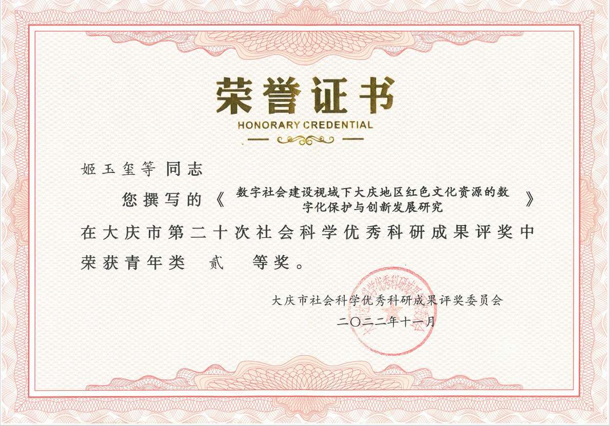 以该研究主要成果《数字社会建设视域下大庆地区红色文化资源数字化保护与创新发展研究报告》为核心内容形成的理论文章《用好龙江红色资源,推进党史教育常态化长效化》被中国共产党黑龙江省委员会主办的党刊《奋斗》杂志收录并在2022年第4期发表。