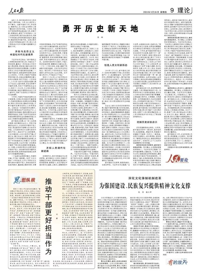 1949年9月16日,新中国成立前夕,毛泽东同志撰写了《唯心历史观的破产》一文,他自豪地宣布:“近代世界历史上那种看不起中国人,看不起中国文化的时代应当完结了。伟大的胜利的中国人民解放战争和人民大革命,已经复兴了并正在复兴着伟大的中国人民的文化。这种中国人民的文化,就其精神方面来说,已经超过了整个资本主义的世界。”75年来,中国共产党始终不忘自己的文化使命,团结带领全国各族人民以创造新的历史继承历史、以创造人类文明新形态礼敬人类文明,为破解“古今中西之争”、丰富人类文明成果宝库、推动人类文明发展进步作出卓越贡献。