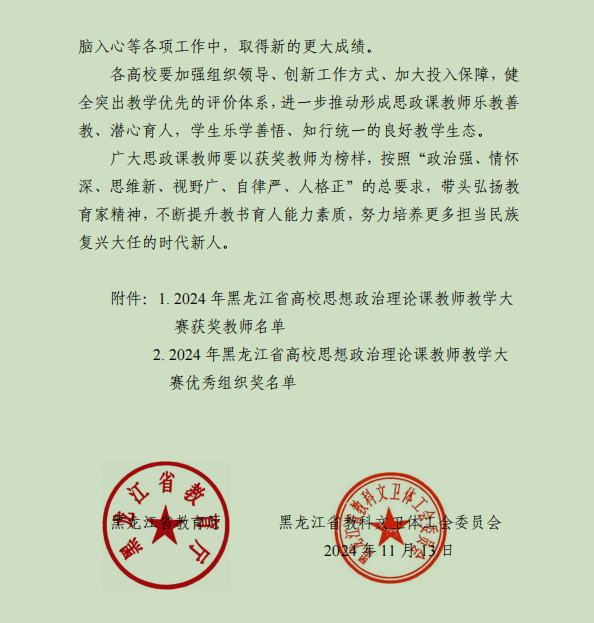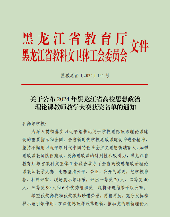近日,黑龙江省教育厅、黑龙江省科教文卫体工会委员会公布了2024 年黑龙江省高校思想政治理论课教师教学大赛评选结果,公司孙媛媛、刘鑫等两名教师在大赛中获三等奖。