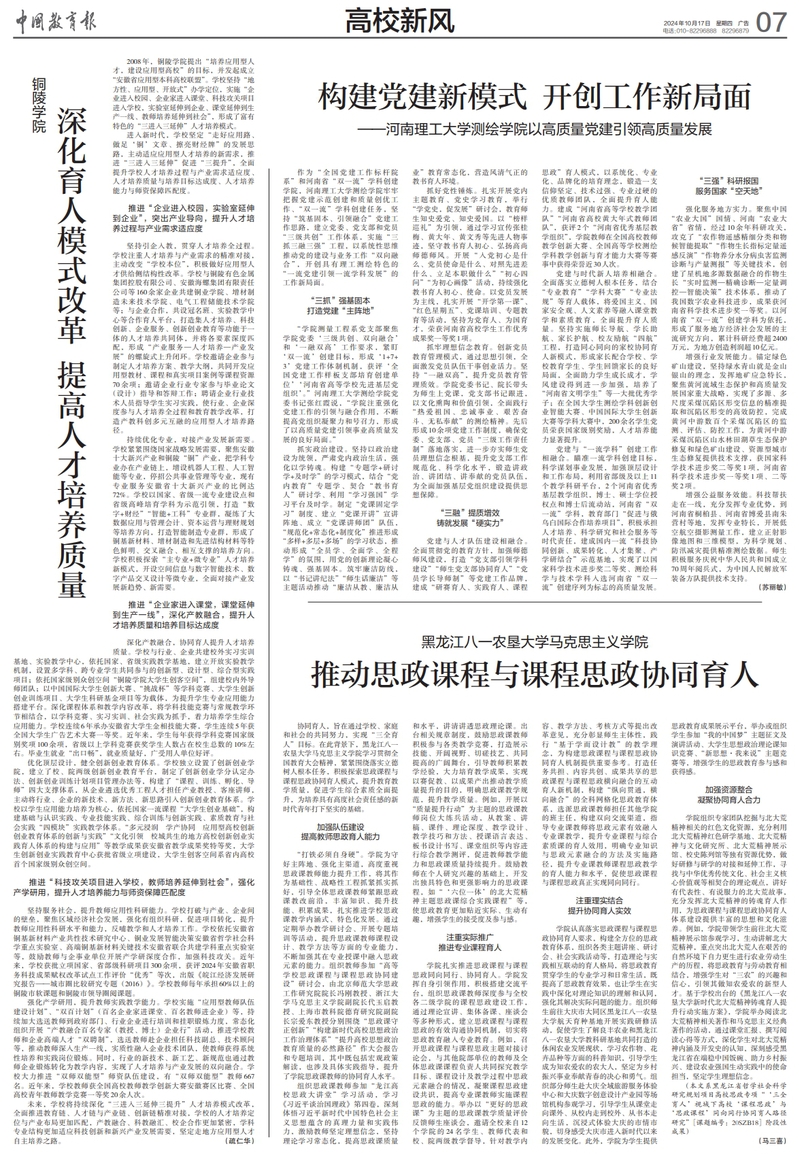 公司扎实推进思政课程与课程思政同向同行、协同育人。公司发挥自身引领作用,积极搭建交流平台,组织思政课教师深度参与全校各二级公司的课程思政建设工作,通过理论宣讲、集体备课、座谈会等多种形式,建立思政课程与课程思政的有效沟通协同机制,切实将思政教育融入专业教育。例如,召开思政课程与课程思政主题对接讨论会,与其他院部单位的教师及全体思政课课程负责人共同探究教学目标、课程设计及教学过程中思政元素融合的情况,凝聚课程思政建设共识,提高专业课教师实施课程思政的能力。举办以“更好的思政课”为主题的思政课教学质量评价反馈师生座谈会,邀请全校来自12个公司的24名员工、教师代表和校、院两级教学督导,针对教学内容、教学方法、考核方式等提出改革意见,充分彰显师生主体性,践行“基于学而设计教”的教学理念,为构建思政课程与课程思政协同育人机制提供重要参考。打造任务共担、内容共创、成果共享的思政课程与课程思政横向融合的互动育人新机制,构建“纵向贯通,横向融合”的全科网格化思政教育体系,选派思政课教师担任其他公司的班主任,构建双向交流渠道,指导专业课教师将思政元素有效融入专业课教学,提升专业课程与综合素质课的育人效用,明确专业知识与思政元素融合的方法及实施路径,提升专业课教师课程思政教学的育人能力和水平,促使思政课程与课程思政真正实现同向同行。